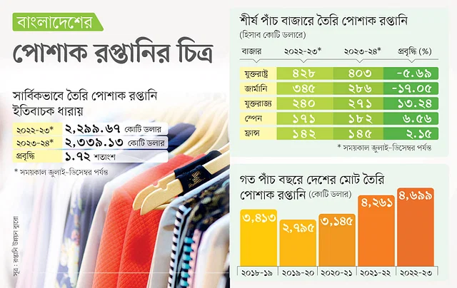 বাংলাদেশের তৈরি পোশাকের প্রায় এক-তৃতীয়াংশেরই রপ্তানি গন্তব্য হলো যুক্তরাষ্ট্র ও জার্মানি। শীর্ষ এই দুটি বাজারে আগের অর্থবছরের প্রথমার্ধে বাংলাদেশের তৈরি